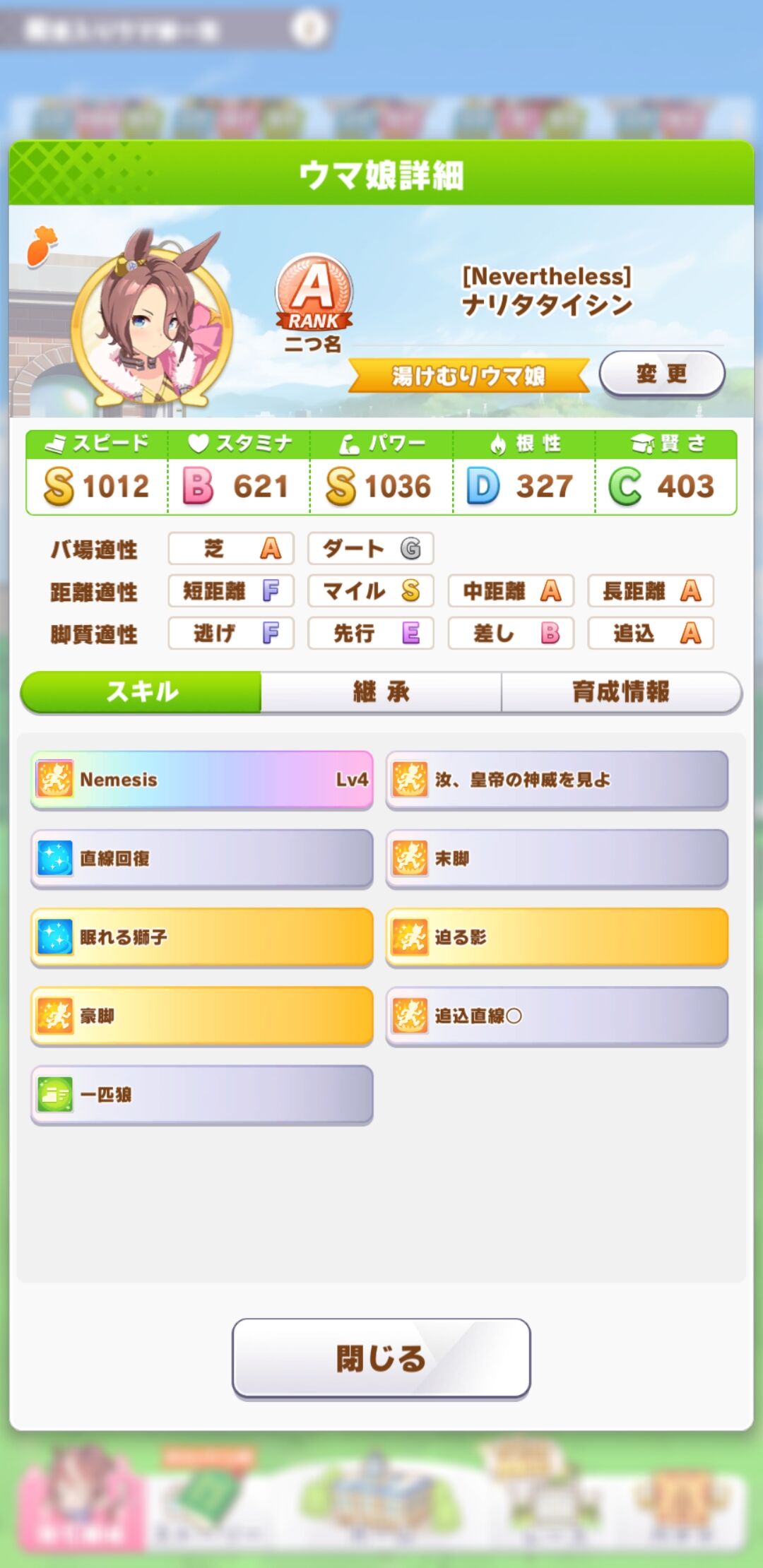 タイシンの不調&練習下手イベントの後はどう動くのが正解なんや? 即5回目のたづなデートで好調まで上げて練習下手は放置が正解? 331 ウマ娘大好きさん (火) 目次1 ナリタタイシンの基本情報11 初期パラメータ12 バ場適性13 距離適性14 脚質適正15 成長率2 育成シナリオ目標3 所持